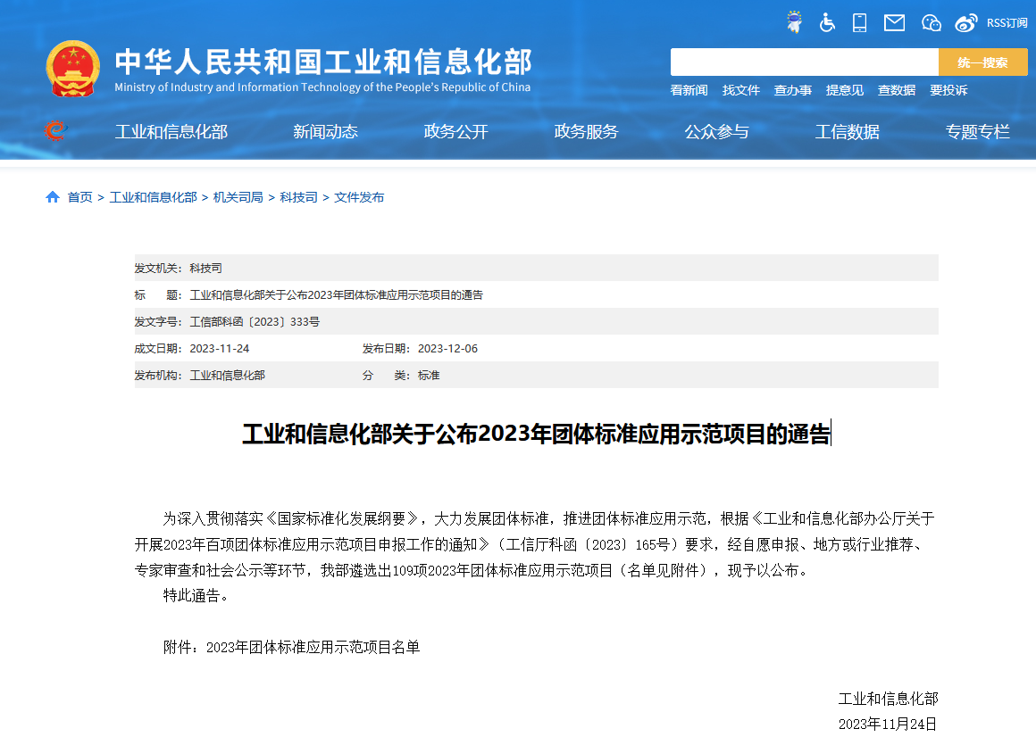 喜報!協會團體標準獲評工信部2023年團體標準應用示范項目