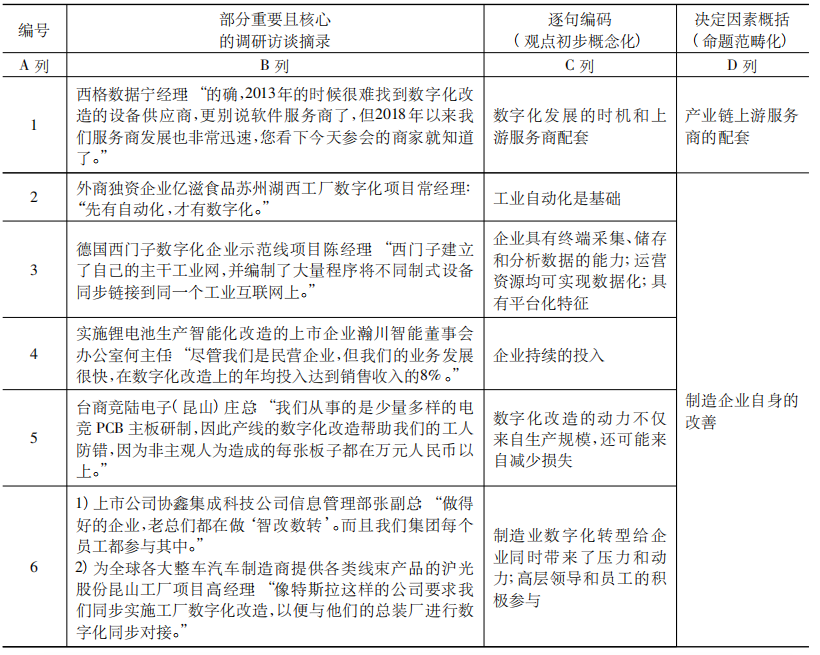 課題組運(yùn)用扎根研究方法,以蘇州制造業(yè)數(shù)字化改造專題調(diào)研的各個(gè)活動(dòng)為研究案例,設(shè)計(jì)了“制造業(yè)數(shù)字化改造決定因素”為主題的研究問(wèn)題和命題,并運(yùn)用扎根理論中調(diào)研記錄、數(shù)據(jù)的收集和分析方法,將參觀、調(diào)研、研討、訪談、座談過(guò)程中凡是對(duì)制造業(yè)數(shù)字化改造產(chǎn)生影響的因素進(jìn)行了編碼匯總,依靠對(duì)記錄、數(shù)據(jù)進(jìn)行不斷地比較、聚類、歸納,實(shí)現(xiàn)從記錄、數(shù)據(jù)到被調(diào)研者的觀點(diǎn)初步概念化,到命題范疇化,到最終研究問(wèn)題的達(dá)成。