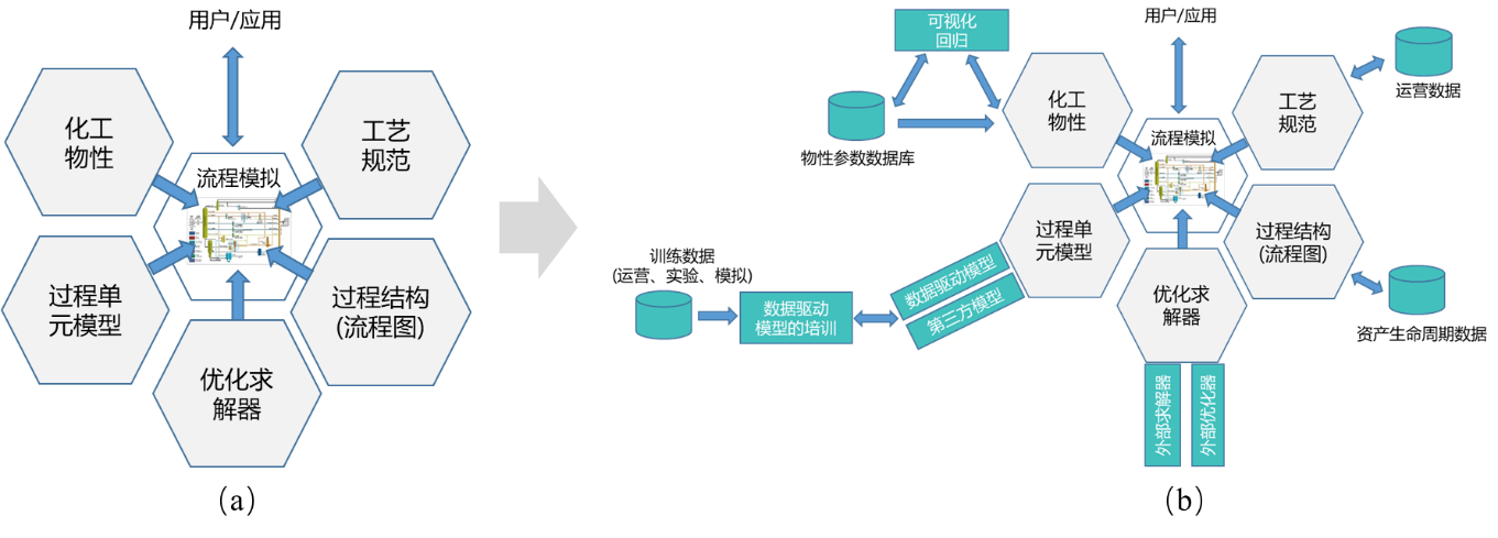 化工流程模擬軟件同樣向平臺化發(fā)展。化工流程模擬軟件應用于工藝設計、虛擬開車、操作員培訓、生產優(yōu)化等工廠全生命周期。經過40多年發(fā)展,領先供應商的產品已經集成穩(wěn) 態(tài)模擬與動態(tài)模擬、集成煉油模擬與化工模擬,主要包括5大功能模塊,即工藝規(guī)范、過程結構(流程圖) 、優(yōu)化求解器、過程單元模型和化工物性,如圖2(a所示,并通過CAPE- OPEN軟件接口標準促進了通用流程模擬軟件平臺與單元模型、熱力學模型組件間的互操作。未來,化工流程模擬平臺軟件的5大模塊將進一步融合生產實時數(shù)據(jù)、實驗數(shù)據(jù)、資產生命周期數(shù)據(jù),進一步集成第三方求解器、優(yōu)化器、大數(shù)據(jù)模型、專用反應器模型、物性數(shù)據(jù)庫等,為打造石化工藝數(shù)字孿生提供平臺化支撐,如圖 2(b)所示。
