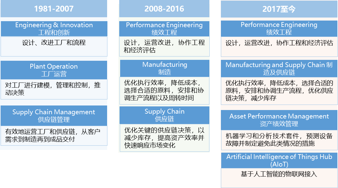 并購發(fā)展階段:從 1996 年起,艾斯本收購了超過 25 個領域中最優(yōu)秀的公司,打造了涵蓋績效工程、制造與供應鏈、資產績效管理三大類軟件的產品線,廣泛應用于能源、化工、制藥、工程設計以及其他采用化學工藝生產產品的行業(yè),如圖 3 所示。這與艾斯本從流程模擬、優(yōu)化到人工智能的業(yè)務發(fā)展邏輯保持同步。2021年 10 月,艾默生以 60 億美元現(xiàn)金獲得艾斯本55% 的多數(shù)股權,并將旗下 OSI 公司的電力軟件和地質建模軟件業(yè)務并入艾斯本業(yè)務中。