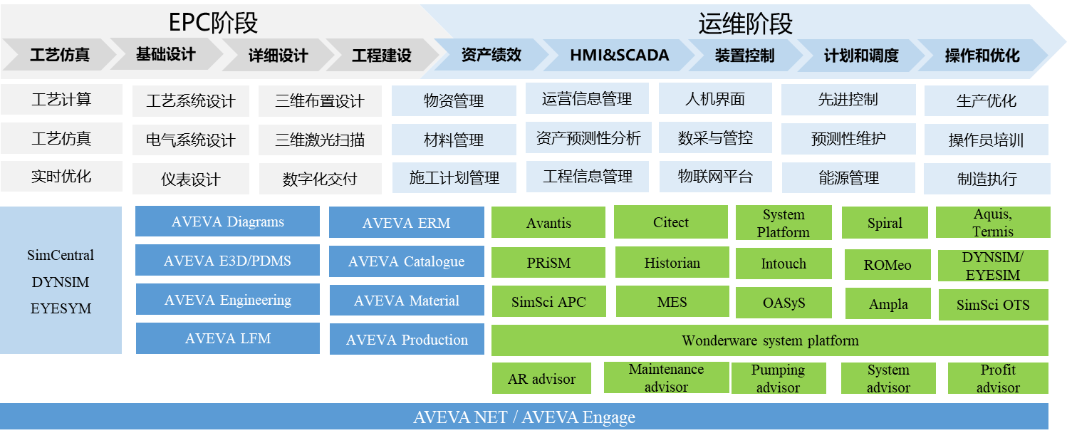 施耐德于2014年收購英維斯(Invesys),2017 年反向收購劍維,并將英維斯的業(yè)務與劍維整合。原來英維斯的軟件,包括用于化工流程模擬的 PRO/II、用于換熱設備和網(wǎng)絡優(yōu)化的HEXTRAN、用于動態(tài)過程模擬的 DYNSIM、用于在線實時優(yōu)化的ROMeo等,現(xiàn)在都集成在劍維品牌下,形成了工程設計集成平臺AVEVA E3D、IE&D、流程模擬平臺軟件、資產績效管理套件,提供從工程設計、工程建設、數(shù)字化交付到生產運營全生命周期的解決方案,如圖 4 所示。