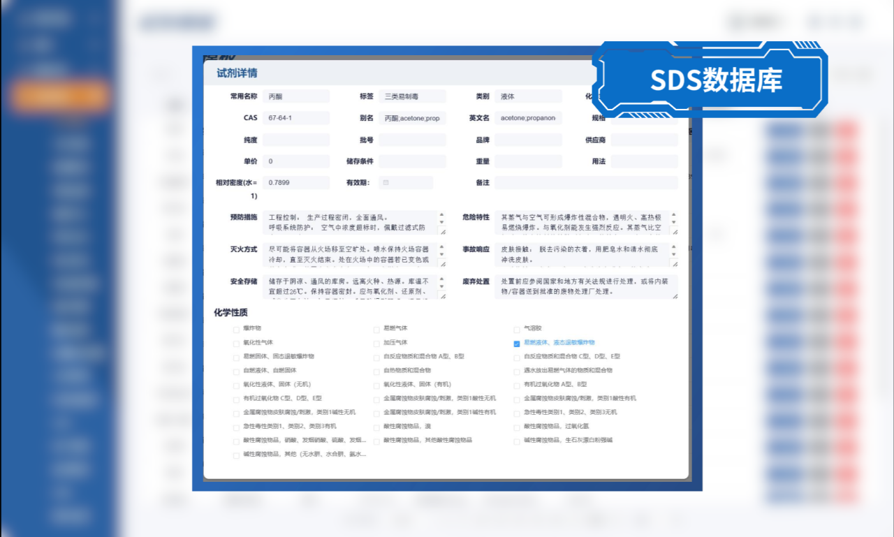 系統(tǒng)提供7000+種化學試劑基礎信息,包括但不限于理化性質、儲存注意事項和禁忌等,持續(xù)收錄更新,便于用戶查詢試劑信息。