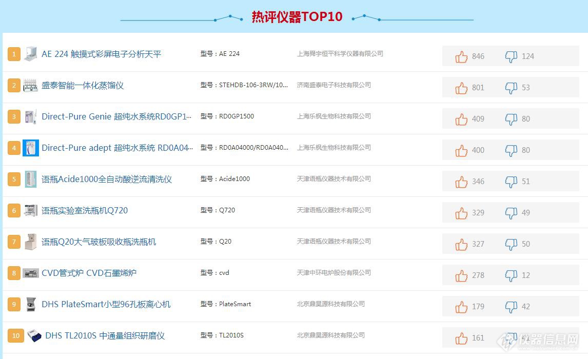 隨著申報儀器數(shù)量的不斷增加,相關儀器的“入圍評審”正式啟動。通過初審的68臺儀器開始接受用戶的入圍評議。在活動專題網(wǎng)站上,用戶通過采取投票和評論的形式,對儀器展開入圍評審。截止日前,剔除惡意刷票后,收到用戶有效投票7686張,評論591條。