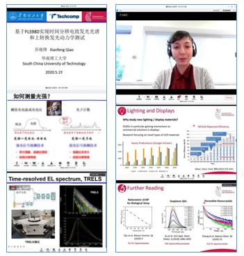 5月19日迎來了第一場以顯示與成像材料為主題的專題講座,榮幸地邀請到來自華南理工大學材料學院的副研究員喬現鋒老師,進行了題為“基于FLS980實現時間分辨電致發光光譜和上轉換發光動力學測試”的報告。深入淺出地介紹了TCSPC原理,時間分辨電致發光的解決方案及上轉換發光動力學的測試實例。來自愛丁堡的應用產品專家Maria博士再次與直播網絡的形式與國內用戶見面,介紹了包含了使用穩態/瞬態熒光,瞬態吸收,拉曼光譜技術在熒光探針、LED與OLED材料、上轉換等發光材料的應用。