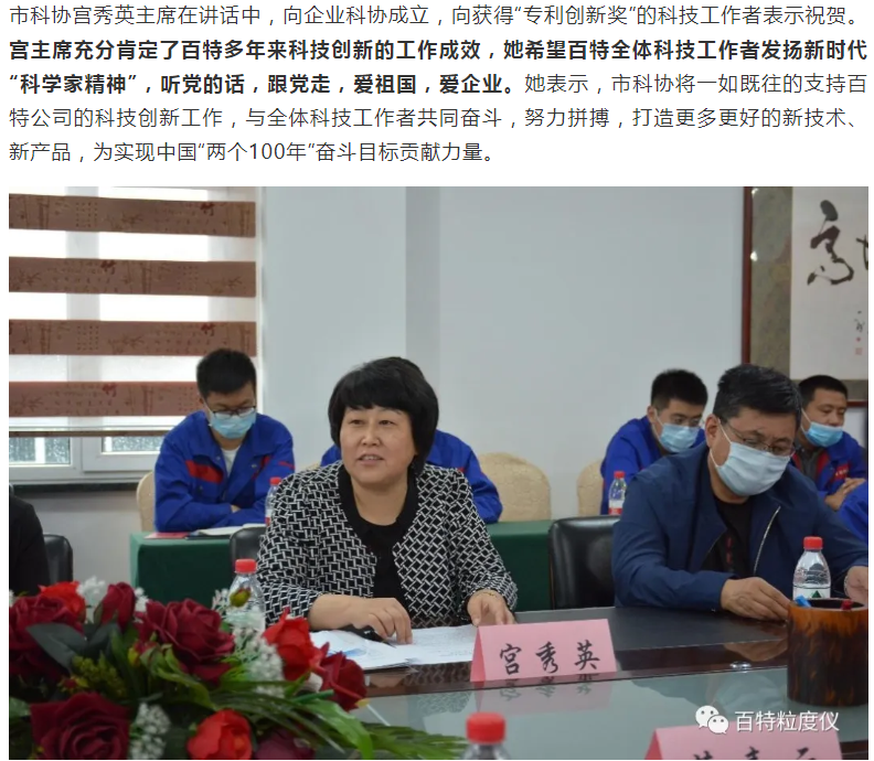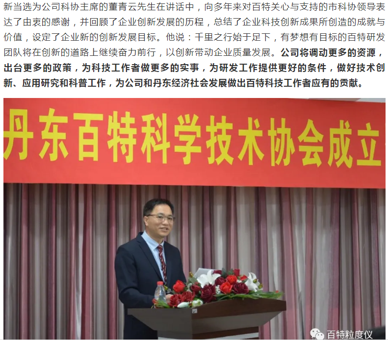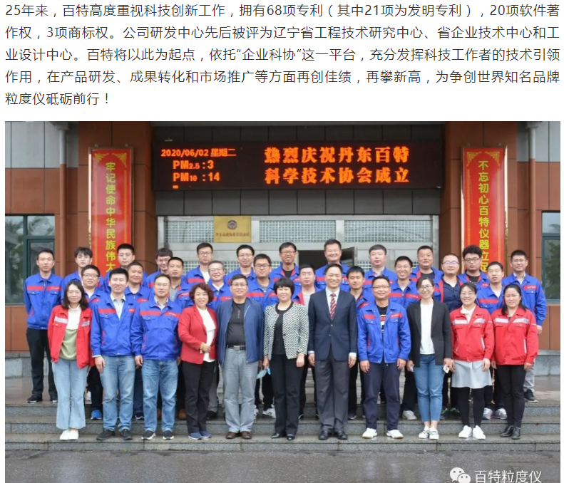 丹東百特儀器有限公司是中國(guó)儀器儀表行業(yè)協(xié)會(huì)會(huì)員單位,主要產(chǎn)品:智能激光粒度儀,顯微圖像粒度粒形分析儀,粉體綜合特性測(cè)試儀,沉降粒度儀,光阻法顆粒計(jì)數(shù)器,PM2.5監(jiān)測(cè)儀,光阻法粒徑譜儀。為提升公司的創(chuàng)新能力,6月2日,丹東百特儀器有限公司隆重召開(kāi)丹東百特科學(xué)技術(shù)協(xié)會(huì)成立暨第一次會(huì)員會(huì)議,丹東市科協(xié)主席宮秀英、副主席劉勇等領(lǐng)導(dǎo)到會(huì)祝賀,百特公司董事長(zhǎng)、總經(jīng)理董青云,副總經(jīng)理劉忠蘭等會(huì)員參加會(huì)議。