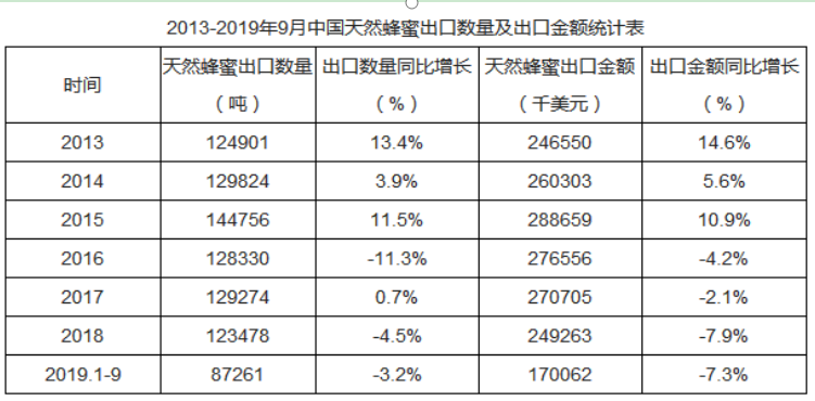 我國是世界上的養蜂大國。蜂群數量、蜂蜜產量、養蜂從業人員和蜂蜜出口四個指標均居世界前列,蜂蜜總產量占世界蜂蜜總產量的四分之一以上,國家統計局數據顯示,2018年全年的蜂蜜產量為44.69萬噸,同比下降21%,2016年—2018年呈下降趨勢。中國也是世界上重要的蜂蜜出口國,出口量居世界首位,2018年中國天然蜂蜜出口數量12.35萬噸,同比下降4.5%;2018年中國天然蜂蜜出口金額為2.5億美元,同比下降7.9%,歐美許多發達國家都是我國的貿易對象。
