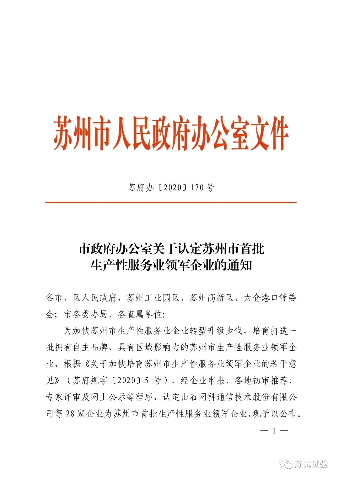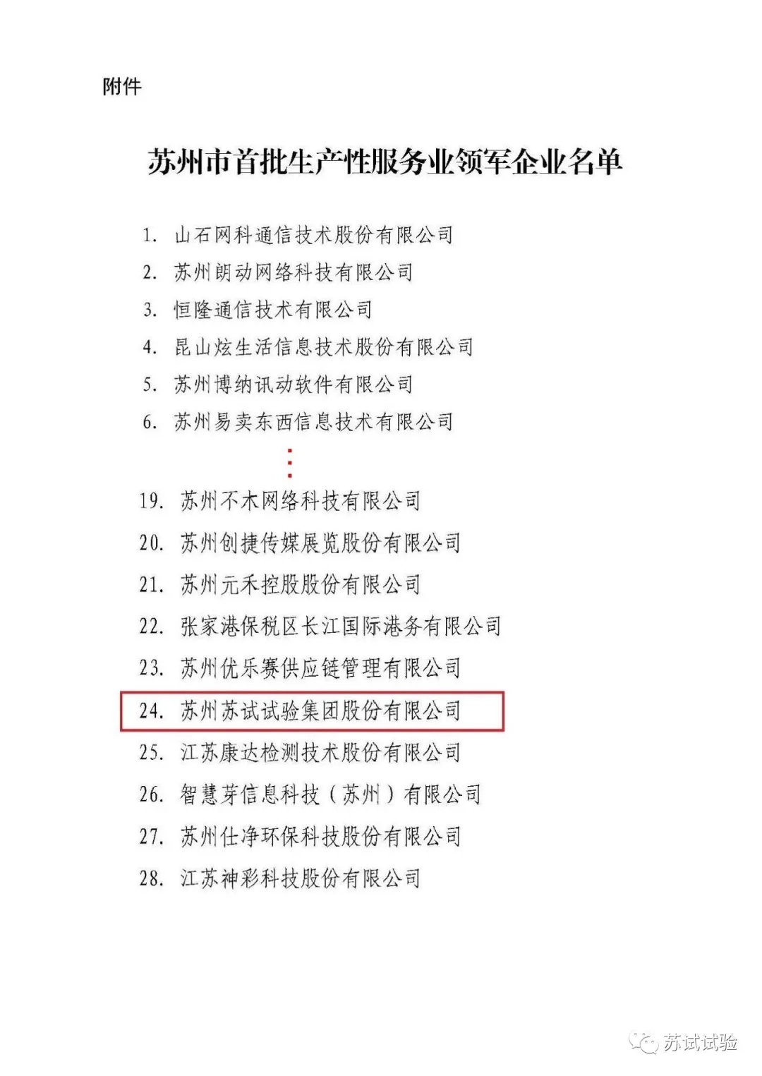 近日,蘇試試驗榮獲“蘇州市首批生產(chǎn)性服務業(yè)領軍企業(yè)”。