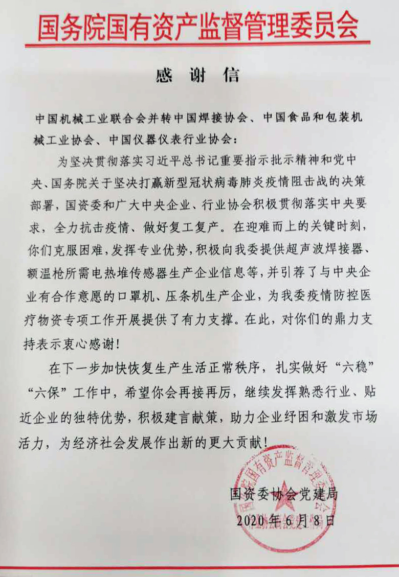 自年初新冠疫情發(fā)生以來,國資委協(xié)會黨建局和國資委系統(tǒng)各級黨組織積極協(xié)調(diào)系統(tǒng)內(nèi)各單位加強(qiáng)有關(guān)防疫物資及相關(guān)產(chǎn)品信息的溝通和橫向聯(lián)系,助力防疫抗疫。我協(xié)會積極參與該活動,利用了解和掌握的行業(yè)情況和會員企業(yè)資源,給國資委協(xié)會黨建局提供與防疫產(chǎn)品相關(guān)的會員和產(chǎn)品信息,為國資委系統(tǒng)防疫抗疫發(fā)揮積極作用,為此,國資委協(xié)會黨建局特發(fā)來感謝信,對我協(xié)會給予表揚(yáng)和感謝。