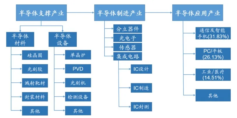 半導體產(chǎn)業(yè)鏈包括上游的半導體支撐產(chǎn)業(yè),中游的半導體制造產(chǎn)業(yè)以及下游的半導體應用產(chǎn)業(yè)。半導體支撐產(chǎn)業(yè)包括半導體材料及設備,其中真空產(chǎn)品主要在半導體設備領域應用;中游半導體制造的核心是集成電路制造,包括IC設計、IC制造以及IC封測;下游的半導體應用領域眾多,全球半導體應用領域排名前三的行業(yè)是通信及智能手機、PC/平板、工業(yè)/醫(yī)療。