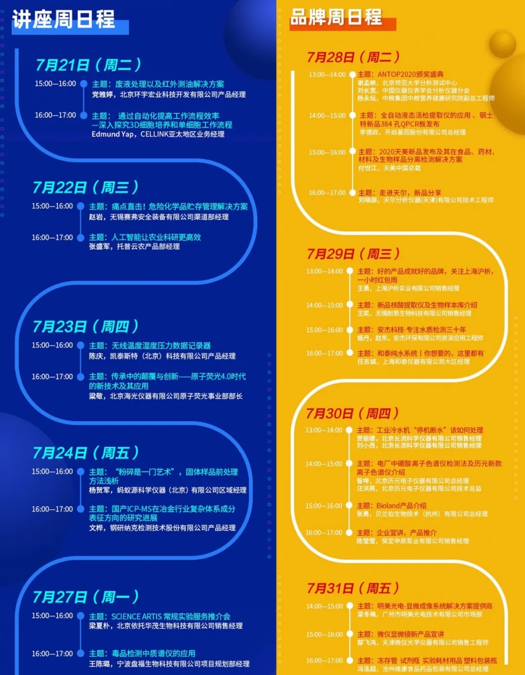“線上直播”部分,2020年7月20日圍繞“2020科學儀器直面‘危’與‘機’”主題邀請了教授級高級工程師、博導、享受國務院特殊津貼專家、寧波永新光學股份有限公司總經理兼技術總監毛磊,北京科學儀器裝備協作服務中心主任孫月琴,高級工程師,北京海關技術中心劉鑫,教授級高工、南京優倍電氣有限公司董事長董健,天美儀拓實驗室設備(上海)有限公司總裁付世江,中國石油東北銷售油品監督檢測中心樊鳴,沃特仕(北京)科技有限公司總經理董國斌,青島盛瀚色譜技術有限公司總經理助理田海峰8位行業嘉賓直播了8場主題報告。