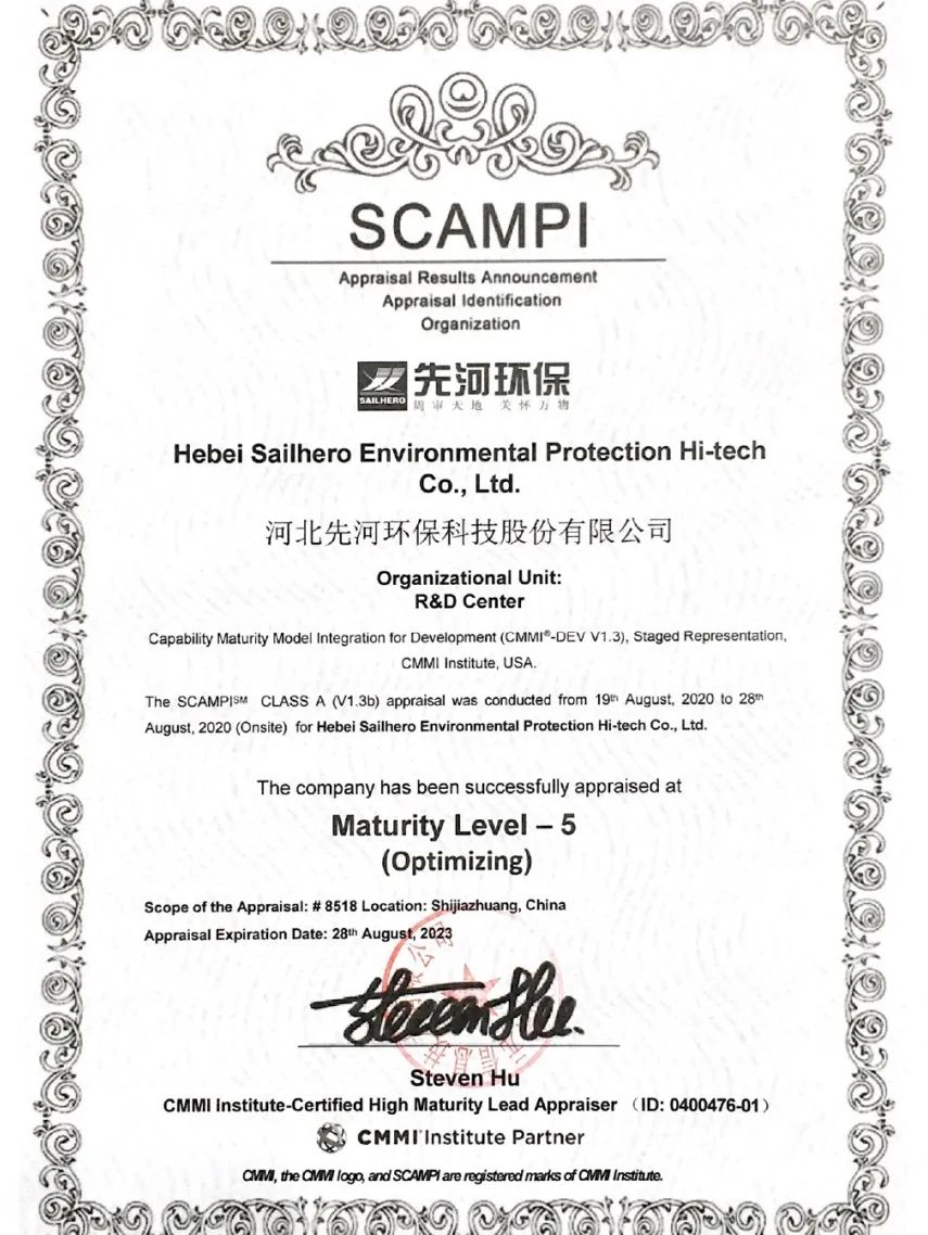 近日,先河環保通過CMMI5級評估認證并取得證書,此資質認證的取得,標志著先河環保在軟件能力成熟度和項目管理方面達到國際水平,是公司研發管理體系標準化、規范化、國際化的重要里程碑,為公司產品的持續創新和升級奠定了堅實的技術基礎。
