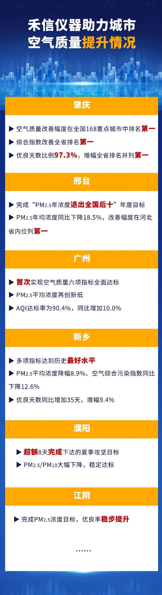 除廣州外,2020年禾信儀器為全國8個省份近30個城市提供空氣質量達標綜合服務項目,從南海之濱到燕山之北、從秀麗江南到關中平原,根據各個城市面臨的不同的環境空氣質量壓力和達標規劃,定制具有針對性的“測管評"聯動服務,助力藍天保衛戰。年末收官、捷報頻傳,一份份亮眼的成績單、一封封感謝信表揚信讓我們備受鼓舞。