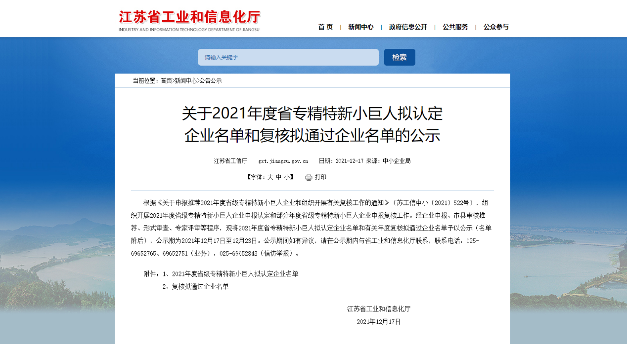 近日,江蘇省工信廳公布2021年度省專精特新小巨人擬認定企業名單和復核擬通過企業名單,江蘇拓米洛環境試驗設備有限公司獲得了小巨人企業(制造業)的認定。