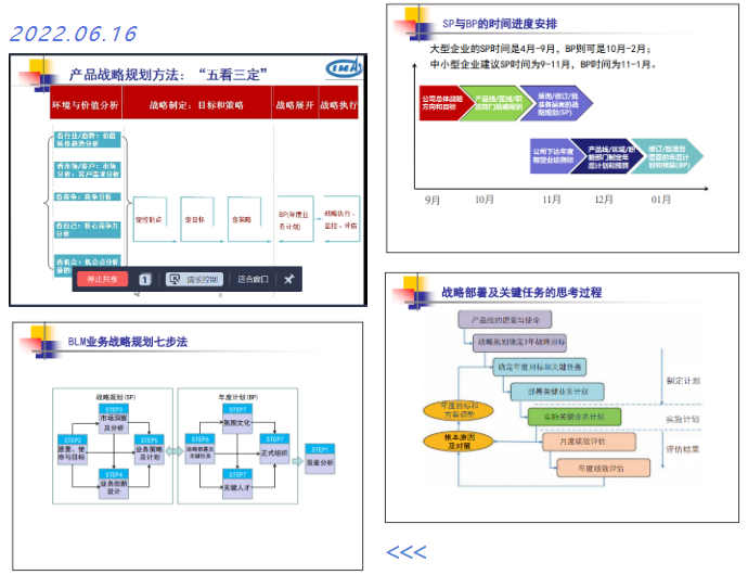 第一步雙差分析,老師介紹了差距的分析過程方法,并提醒要留意分析不全、根因分析不透和急于求成的問題。第二步,戰(zhàn)略使命目標(biāo),老師強調(diào)了其重要性,并從創(chuàng)造價值角度舉例說明了企業(yè)總體戰(zhàn)略、業(yè)務(wù)單元戰(zhàn)略和職能戰(zhàn)略的使命、目標(biāo)都應(yīng)該是什么。第三步,市場洞察工具方法及關(guān)注點,老師梳理了市場洞察的邏輯關(guān)系、“五看三定”的邏輯關(guān)系,并分享了宏觀環(huán)境分析方法、制造業(yè)常見的關(guān)鍵成功因素和競品分析的工具方法。第四步,業(yè)務(wù)創(chuàng)新設(shè)計,老師強調(diào)戰(zhàn)略控制點一定要能有效保證戰(zhàn)略實現(xiàn),即,要有差異、有一定門檻、一定時間內(nèi)很難復(fù)制和超越,給自己留有紅利期,此外還要明確產(chǎn)品的價值定位、盈利模式及增長途徑。第五步,業(yè)務(wù)計劃及產(chǎn)品路標(biāo)規(guī)劃,老師分享了如何定目標(biāo)(財務(wù)目標(biāo)和市場目標(biāo))、如何定戰(zhàn)略控制點、如何定策略(包括營銷策略、研發(fā)策略、供應(yīng)策略、采購策略、服務(wù)策略等產(chǎn)品的各個環(huán)節(jié))的方法。對于第六步年度規(guī)劃,老師從戰(zhàn)略部署及關(guān)鍵任務(wù)的思考過程模型進(jìn)行分析,并介紹了如何對關(guān)鍵任務(wù)進(jìn)行優(yōu)先級排序。最后一步,老師介紹了BLM對戰(zhàn)略執(zhí)行的支撐。