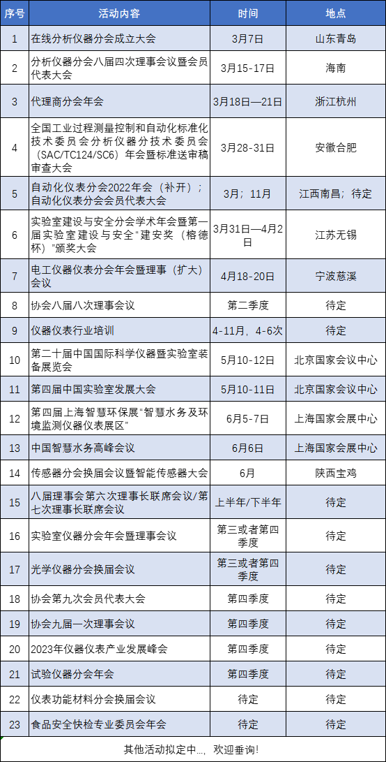 為發揮中國儀器儀表行業協會支撐政府、服務行業的橋梁作用,促進行業間交流與合作,引導產業健康發展,推進各項工作的開展,更好地為協會會員單位服務,特制定中國儀器儀表行業協會2023年度主要活動安排,供大家了解參與。