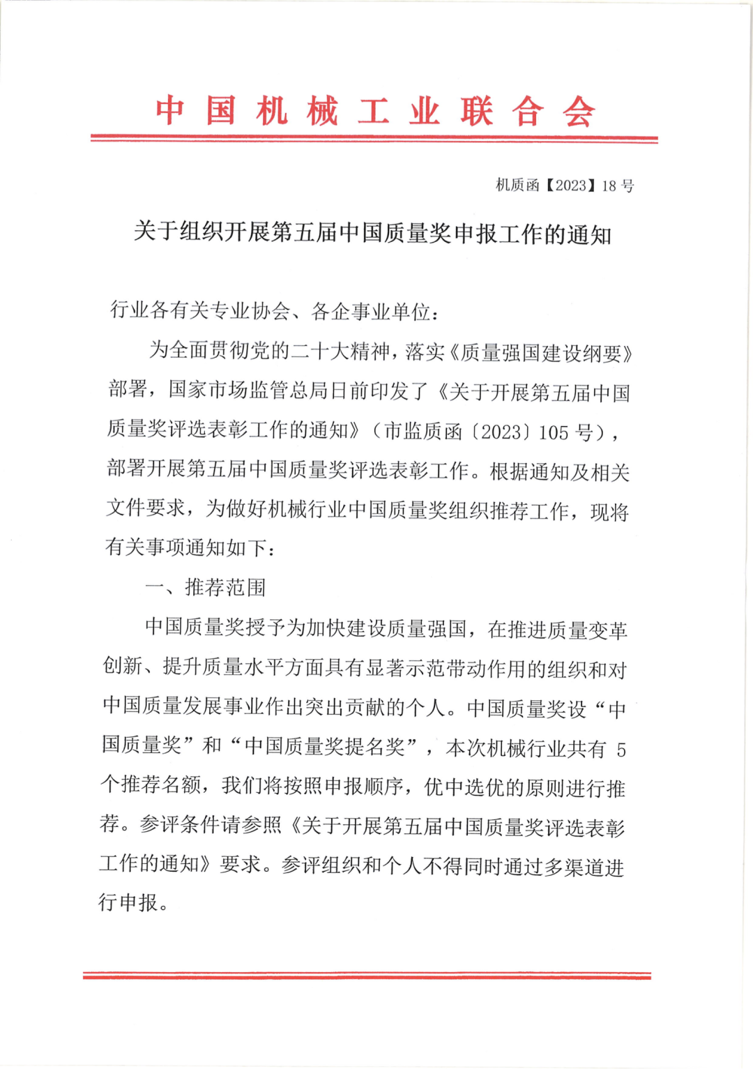 為全面貫徹黨的二十大精神,落實(shí)《質(zhì)量強(qiáng)國(guó)建設(shè)綱要》部署,國(guó)家市場(chǎng)監(jiān)管總局日前印發(fā)了《關(guān)于開(kāi)展第五屆中國(guó)質(zhì)量獎(jiǎng)評(píng)選表彰工作的通知》(市監(jiān)質(zhì)函〔2023〕105號(hào)),部署開(kāi)展第五屆中國(guó)質(zhì)量獎(jiǎng)評(píng)選表彰工作。根據(jù)通知及相關(guān)文件要求,為做好機(jī)械行業(yè)中國(guó)質(zhì)量獎(jiǎng)組織推薦工作,現(xiàn)將有關(guān)事項(xiàng)通知如下: