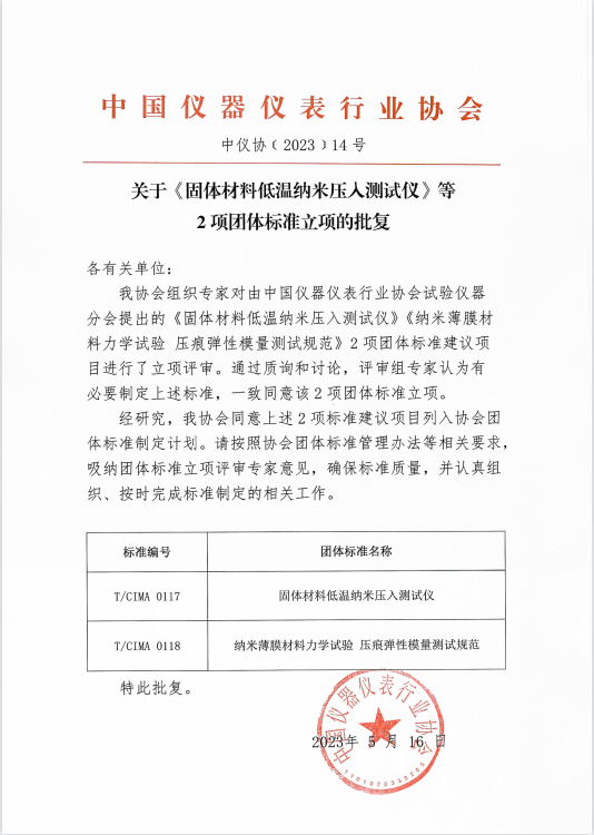 我協(xié)會(huì)組織專家對(duì)由中國儀器儀表行業(yè)協(xié)會(huì)試驗(yàn)儀器分會(huì)提出的《固體材料低溫納米壓入測試儀》《納米薄膜材料力學(xué)試驗(yàn) 壓痕彈性模量測試規(guī)范》2項(xiàng)團(tuán)體標(biāo)準(zhǔn)建議項(xiàng)目進(jìn)行了立項(xiàng)評(píng)審。通過質(zhì)詢和討論,評(píng)審組專家認(rèn)為有必要制定上述標(biāo)準(zhǔn),一致同意該2項(xiàng)團(tuán)體標(biāo)準(zhǔn)立項(xiàng)。