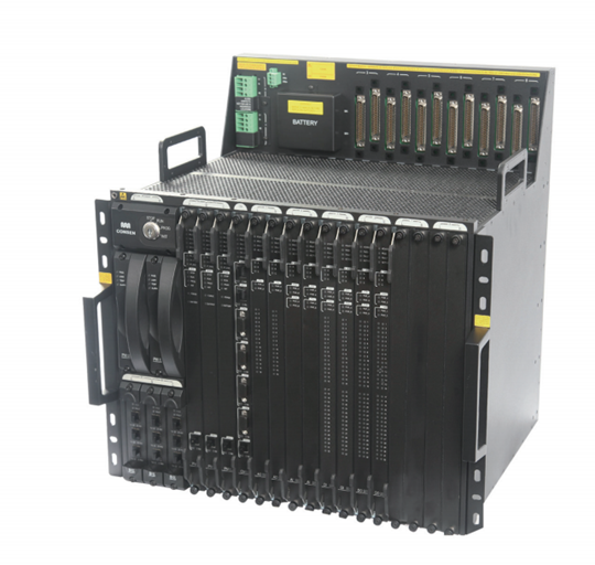 總線接口模塊對(duì)外包含3個(gè)光纖接口,供應(yīng)商或系統(tǒng)集成商可以根據(jù)實(shí)際項(xiàng)目的需要選擇采用星型拓?fù)浣Y(jié)構(gòu)擴(kuò)展遠(yuǎn)程機(jī)架還是采用總線拓?fù)?。由于?xiàng)目的差異性,遠(yuǎn)程機(jī)架與主機(jī)架的相對(duì)分布各不相同,靈活的拓?fù)淇梢詭椭脩舯M量節(jié)省布線費(fèi)用。