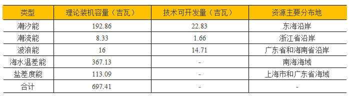 據聯合國環境署數據顯示,溫差能、波浪能、鹽差能和潮汐/潮流能開發潛力分別占到了全球海洋能開發潛力的58%39%2%2%。其中,我國海洋能發電蘊藏量約占全球海洋能總蘊藏量的8%,近海海洋能資源理論裝機容量約為697吉瓦,技術可開發量超過70吉瓦;深遠海海域的波浪能資源遠超近海海域,同時具有豐富的洋流能資源。