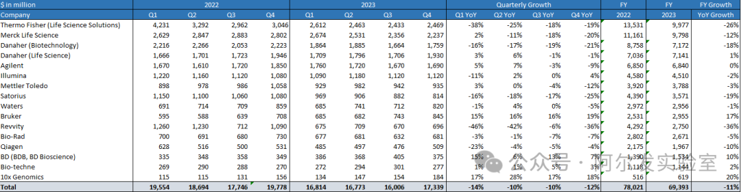 這16家公司的業績總數跌了11%,我們可以大膽地假設,整個生命科學市場差不多也跌了這個水平,甚至更多,因為這16家公司已經是市面上最大的公司了,小公司日子只可能更難過。去年的市場萎縮了10%以上,相信這個結論大家從主觀的感受上也能差不多體會到。當然如果把新冠因素去掉的話,可能市場的跌幅在10%以內,畢竟這些公司在2022還是吃了一些紅利的。
