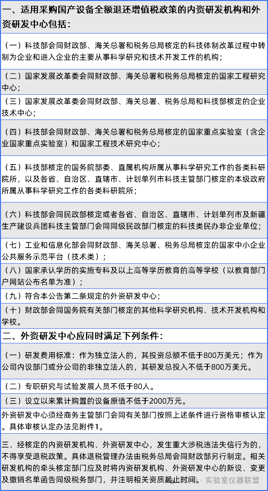 《辦法》明確提出:為鼓勵科學研究和技術開發,促進科技進步,在20271231日前,繼續對內資研發機構和外資研發中心采購國產設備全額退還增值稅。