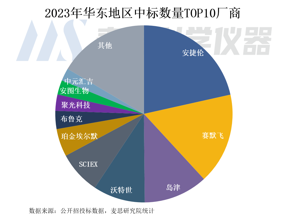華東地區(qū)質(zhì)譜儀器中標(biāo)數(shù)量Top 5企業(yè)分別為安捷倫、賽默飛、島津、沃特世和SCIEX,Top 5占比超65%。國(guó)內(nèi)廠商中,聚光科技、安圖生物和中元匯吉三家企業(yè)進(jìn)入Top 10行列。