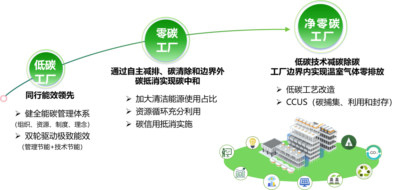 PhaseⅢ—凈零碳工廠:這個(gè)階段的建設(shè)目標(biāo)更為嚴(yán)苛,需要通過(guò)低碳工藝改造、生態(tài)碳匯、碳捕集利用封存等技術(shù)的應(yīng)用,實(shí)現(xiàn)工廠邊界范圍內(nèi)的溫室氣體零碳放。