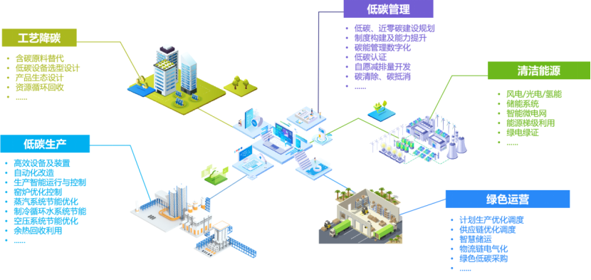 PhaseⅡ—零碳工廠:在低碳工廠的基礎(chǔ)上進(jìn)一步通過(guò)能源結(jié)構(gòu)調(diào)整、資源循環(huán)利用、碳清除、碳抵消等方式實(shí)現(xiàn)整體對(duì)外溫室氣體排放為零。