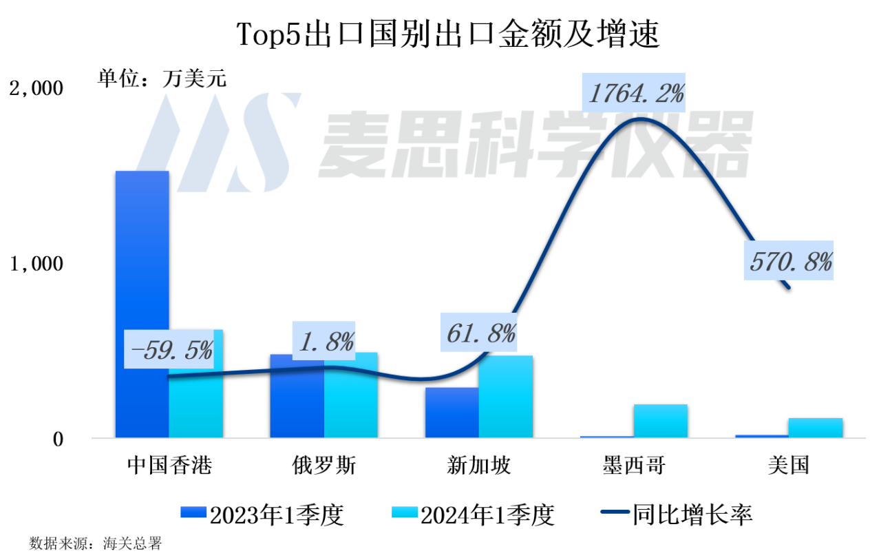 中國(guó)質(zhì)譜儀器的出口主要集中在“其他質(zhì)譜儀器”類(lèi)別,2024年1季度出口額為1800萬(wàn)美元,同比下降了25%。與此同時(shí),質(zhì)譜聯(lián)用儀的出口額約為500萬(wàn)美元,與去年同期相比增長(zhǎng)了84%,盡管增速顯著,但由于其基數(shù)較小,實(shí)際增長(zhǎng)額僅為240萬(wàn)美元。