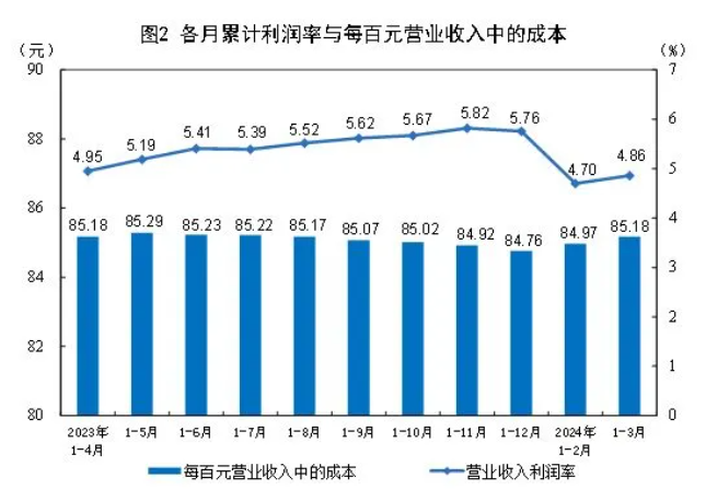 1-3月份,規模以上工業企業實現營業收入30.96萬億元,同比增長2.3%;發生營業成本26.38萬億元,增長2.5%;營業收入利潤率為4.86%,同比提高0.09個百分點。