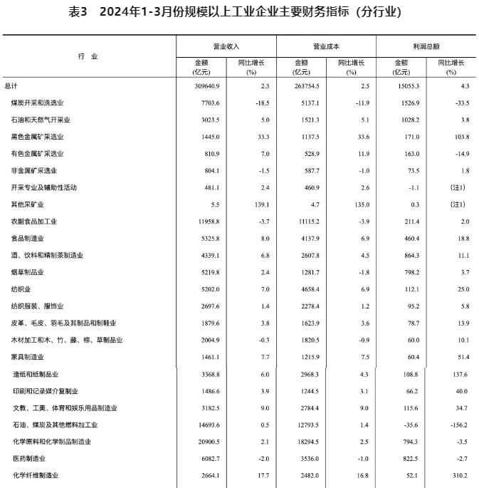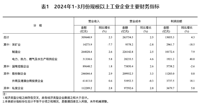 2024年1-3月份,全國規模以上工業企業實現利潤總額15055.3億元,同比增長4.3%(按可比口徑計算)。