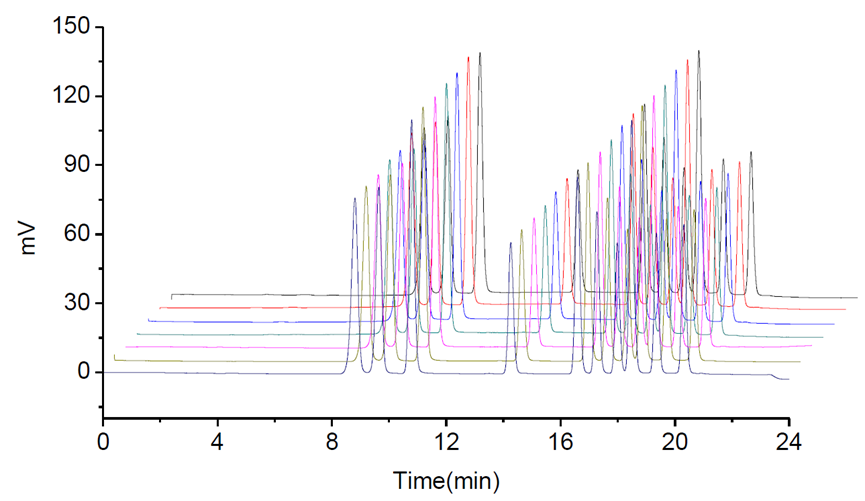連續(xù)進(jìn)樣7次,譜圖及RSD結(jié)果均顯示進(jìn)樣重現(xiàn)性非常好: