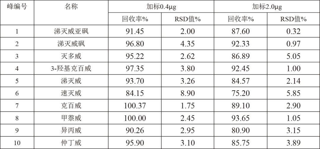 實(shí)際樣品(蘋(píng)果基質(zhì))中的10中氨基甲酸酯類(lèi)農(nóng)殘回收率均在84.15% ~ 100.37%之間,RSD值均小于4.35%,充分說(shuō)明該方法結(jié)果準(zhǔn)確,穩(wěn)定可靠。