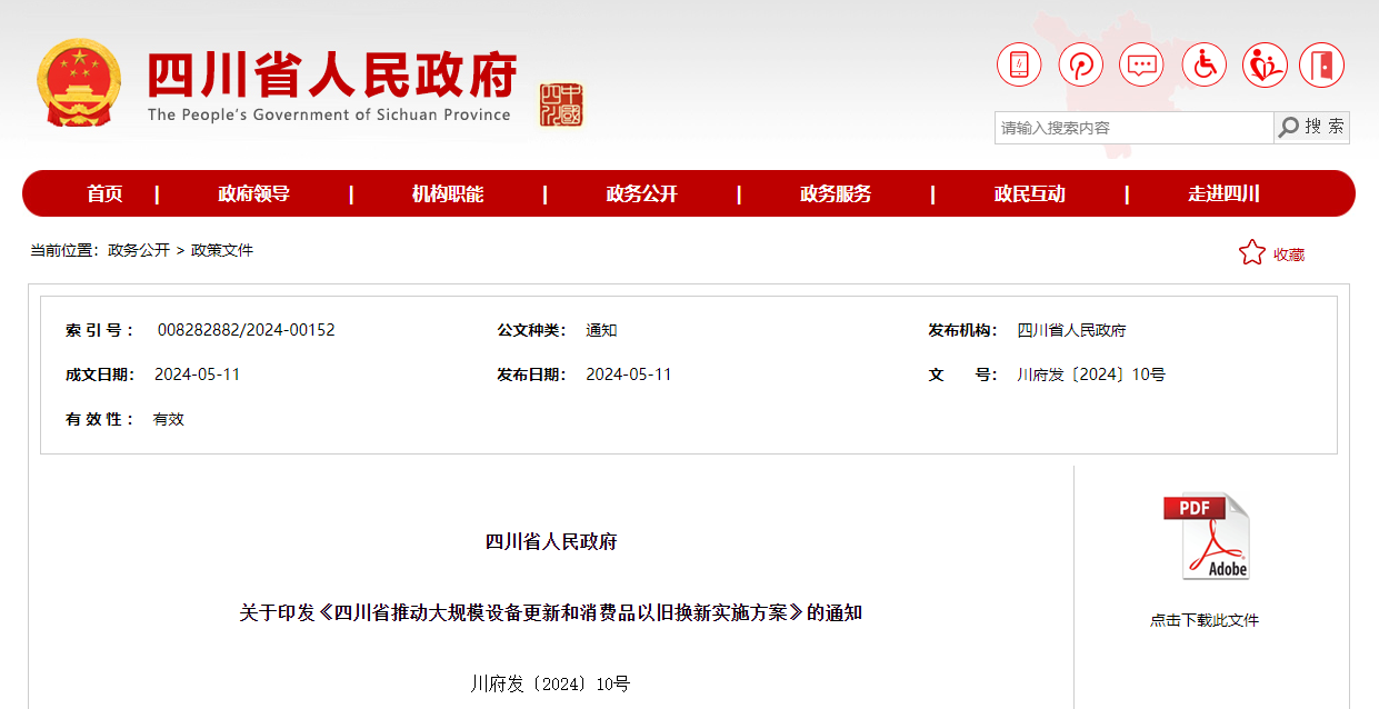 5月11日四川省人民政府網站發布關于印發《四川省推動大規模設備更新和消費品以舊換新實施方案》的通知。