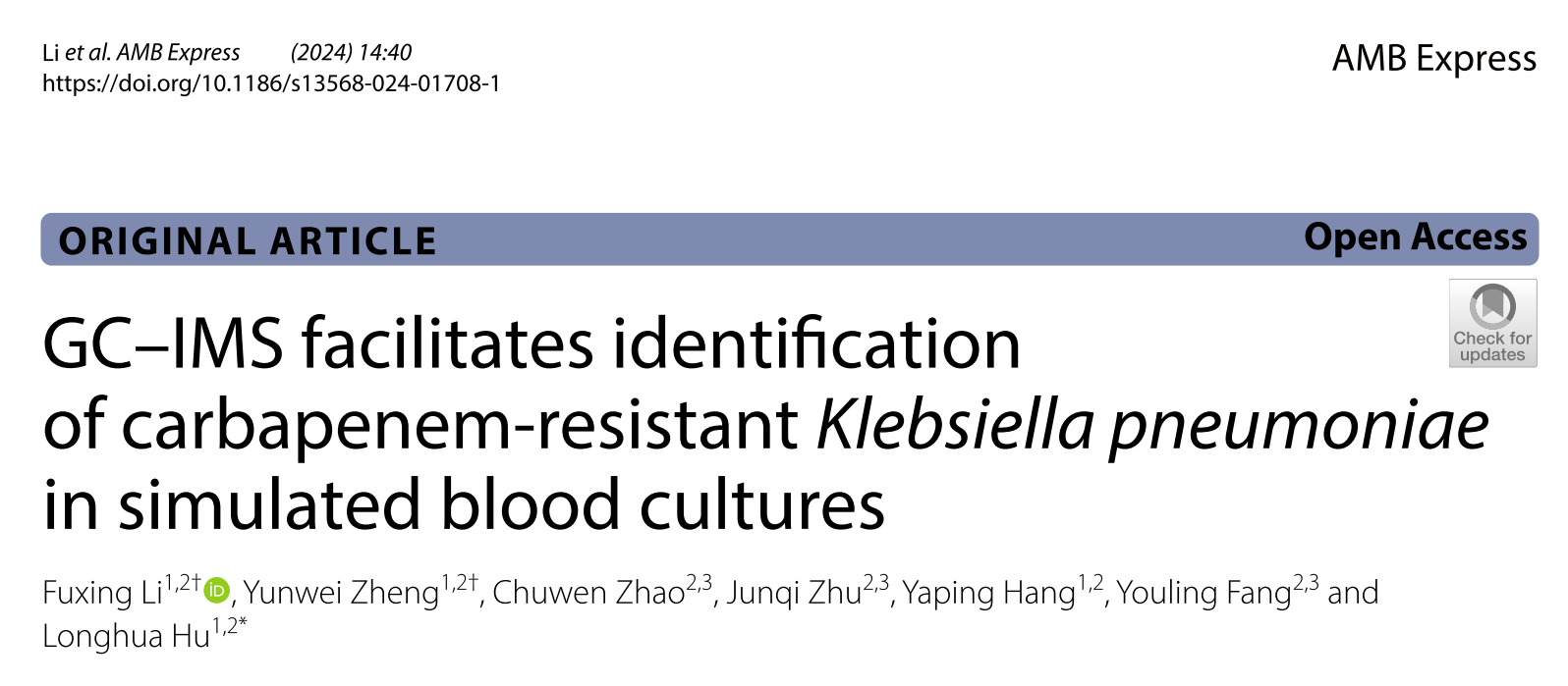 近日,南昌大學第二附屬醫院檢驗科胡龍華教授團隊基于氣相色譜-離子遷移譜聯用(GC-IMS)技術,通過測定CRKP和碳青霉烯類抗生素敏感的肺炎克雷伯菌(CSKP)在血培養過程中產生的代謝性揮發性有機化合物(VOCs)的特異性改變,實現了對CRKP的快速鑒定,其研究成果發表在應用微生物領域專業期刊AMB Express上(圖 1),為臨床微生物快速鑒定和藥敏試驗提供了一個新思路。