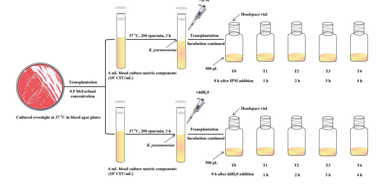 胡龍華教授團隊基于KP4種標準菌株和69株臨床分離株展開研究,使用相同的血培養條件,所有菌株產生的VOCs分別在氣相色譜離子遷移譜聯用儀(FlavourSpec®)上檢測,為了觀察亞胺培南(IPM,一種碳青霉烯類抗生素,具有超廣譜、高效能的抗菌活性,對多種病原體所導致的中重度混合感染有明顯的抗菌作用)對CSKPCRKP的作用,標準菌株在血培養3h后分別加入終濃度為0.25mg/mLIPM,并設置4個連續的時間點分別對菌液進行VOCs的檢測。同時為了探索鑒定產碳青霉烯酶(CBPM)的KP,對CRKP各亞型加入CBPM抑制劑進行研究。相關的實驗流程圖詳見圖 2