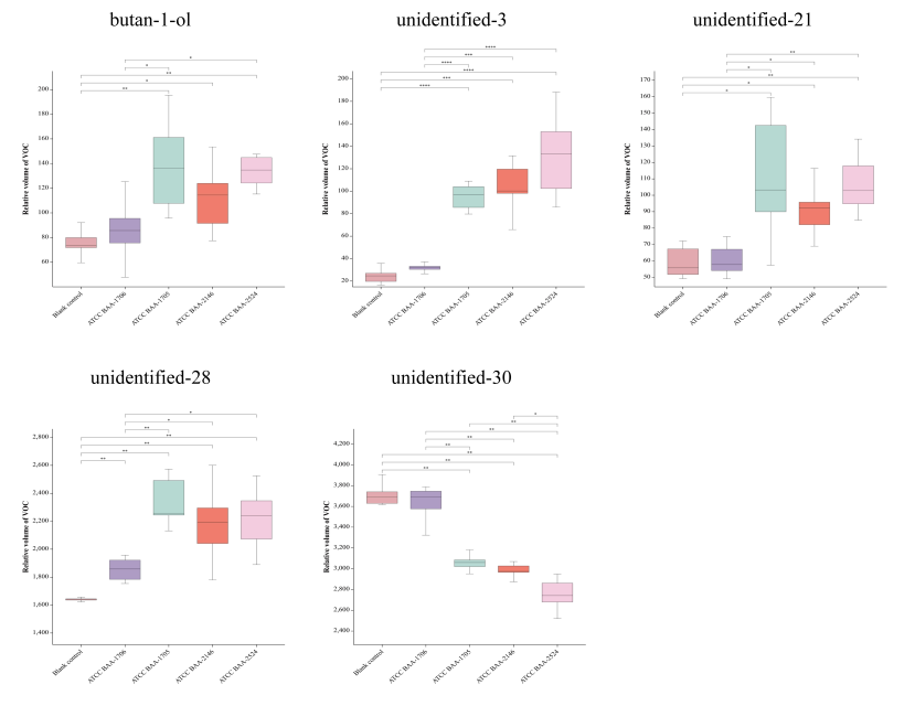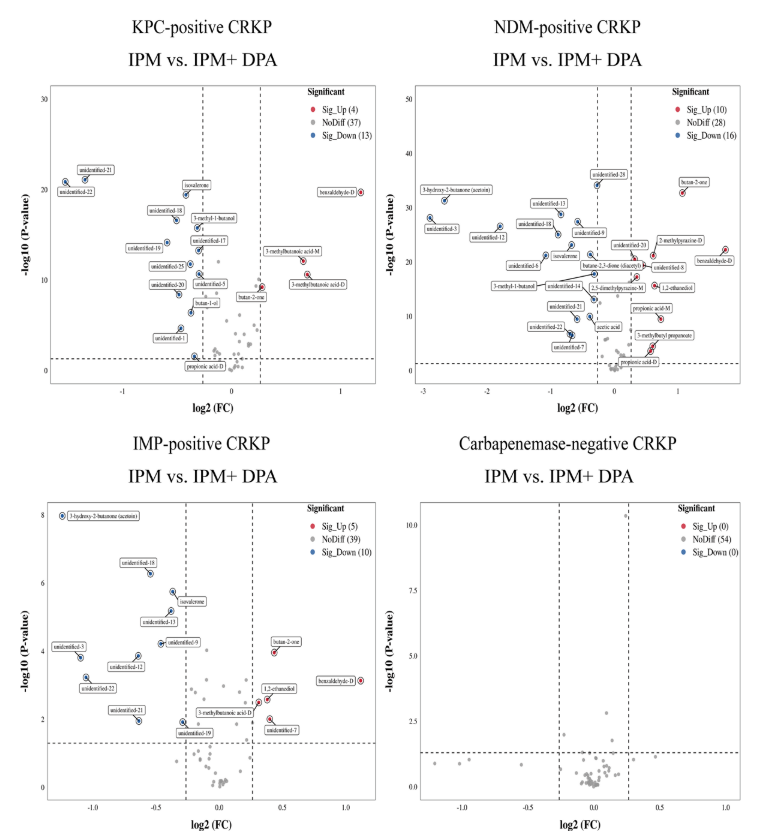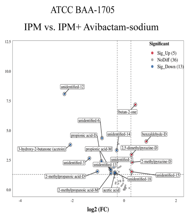 針對臨床分離株,通過VOCs的檢測鑒定產CBPMCRKP,同標準菌株同樣的實驗操作方法,以加入B類酶抑制劑(DPA)為例,在T2時間點對VOCs進行檢測,結果發現在加入DPA后,部分VOCs出現了顯著的變化,包括KPC陽性株出現了4VOC的升高和8VOCs的降低;NDM陽性株出現了8VOCs的升高和11VOCs的降低;相比于NDM陽性株,IPM陽性株出現了1,2-乙二醇的升高和3-羥基-2-丁酮以及4種未定性VOCs的降低(圖 9)。