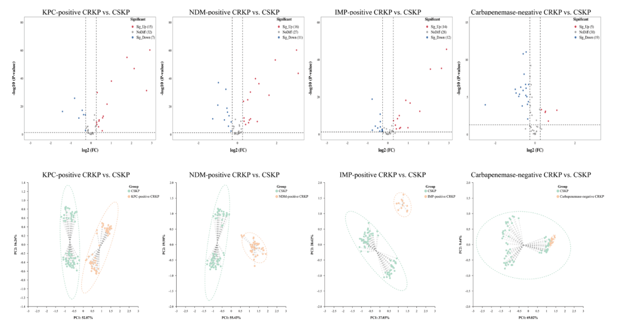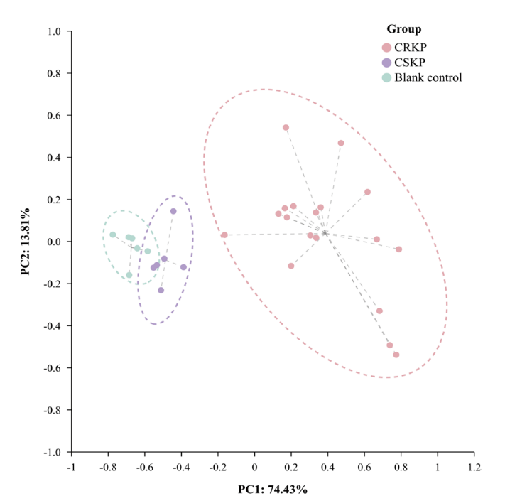 CRKPCSKP的鑒定中,在不添加IPM的條件下,通過檢測標準菌株的VOCs,發現5VOCs在兩個組別種存在顯著性差異,相對于CSKP,CRKP的未定性物質3#21#、28#和正丁醇含量增加,而未定性物質30#含量減少(圖 3)。之后主成分分析顯示上述5VOCs可有效地區分CSKPCRKP(圖 4),但這一差異會隨著時間推移而消失。