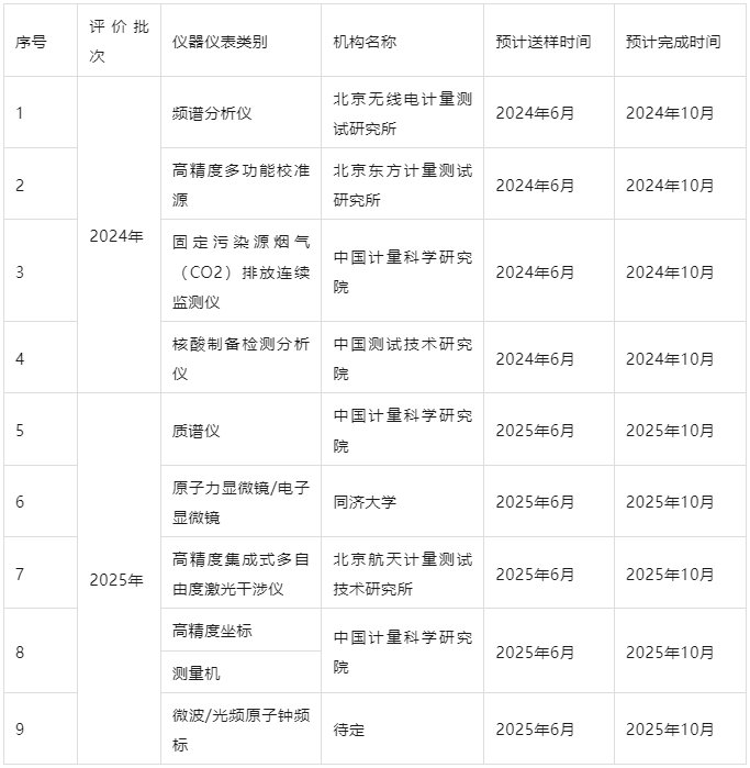 (四)評價試驗(2024年6月—2025年10月)。此次計量測試評價根據儀器儀表類別分兩個年度批次進行(具體見附件3)。確定參加此次計量測試評價的儀器儀表生產企業,按批次要求時間向市場監管總局指定的計量測試評價機構提交滿足要求的樣機。計量測試評價機構制定計量測試評價規范和工作方案,對產品開展計量測試評價,并出具計量測試評價報告。