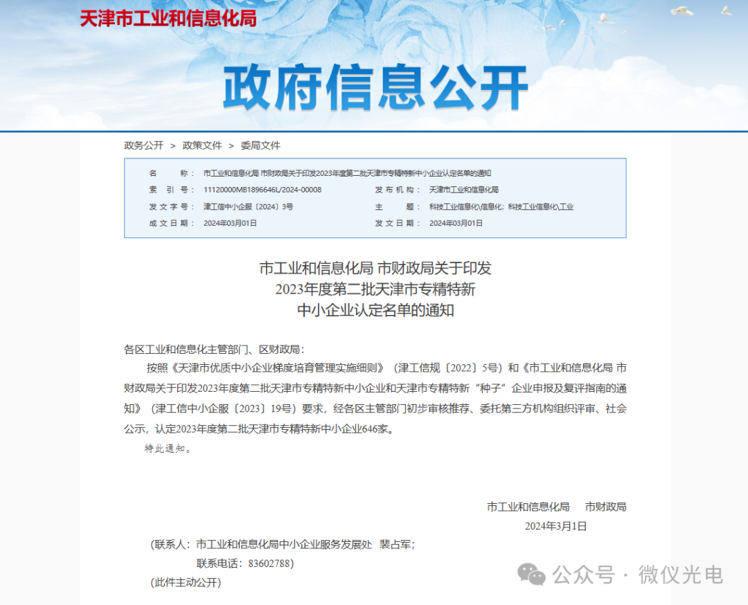 2024年3月1日,天津市工業(yè)和信息化局官方網(wǎng)站發(fā)布了《市工業(yè)和信息化局 市財政局關(guān)于印發(fā)2023年度第二批天津市專精特新中小企業(yè)和天津市專精特新“種子”企業(yè)申報及復(fù)評指南的通知》,微儀光電(天津)有限公司(以下簡稱“微儀光電”)榜上有名,獲評“專精特新”中小企業(yè)稱號!這是一項(xiàng)非常重要的榮譽(yù),也是我公司多年專注技術(shù)創(chuàng)新和不斷提升核心競爭力的成果。