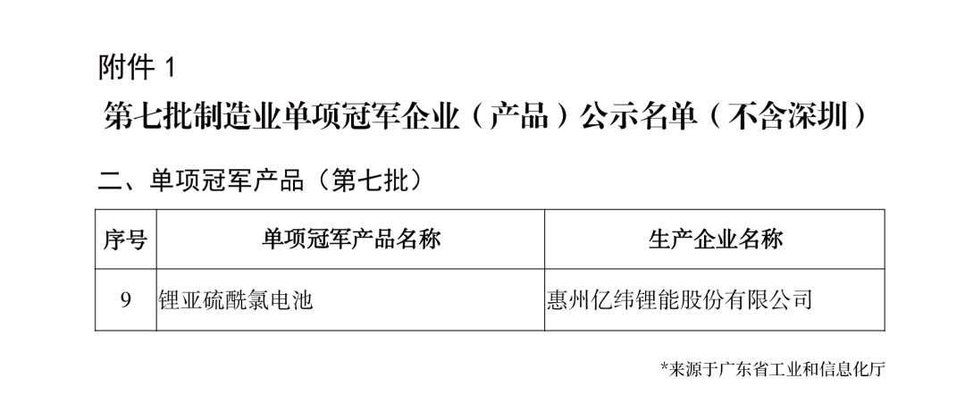 億緯鋰能鋰亞電池入選國家級制造業單項冠軍產品