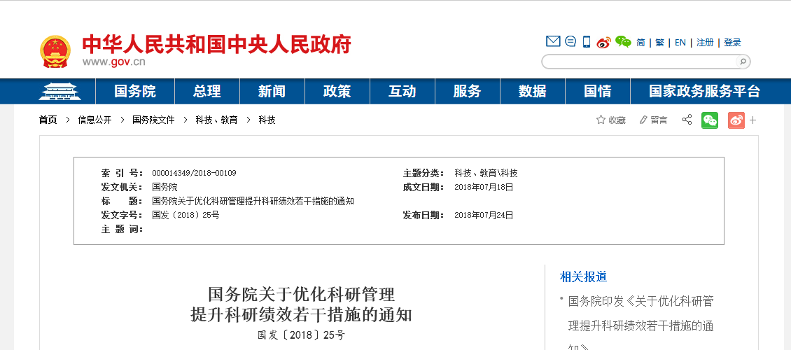 國務院關于優化科研管理提升科研績效若干措施的通知