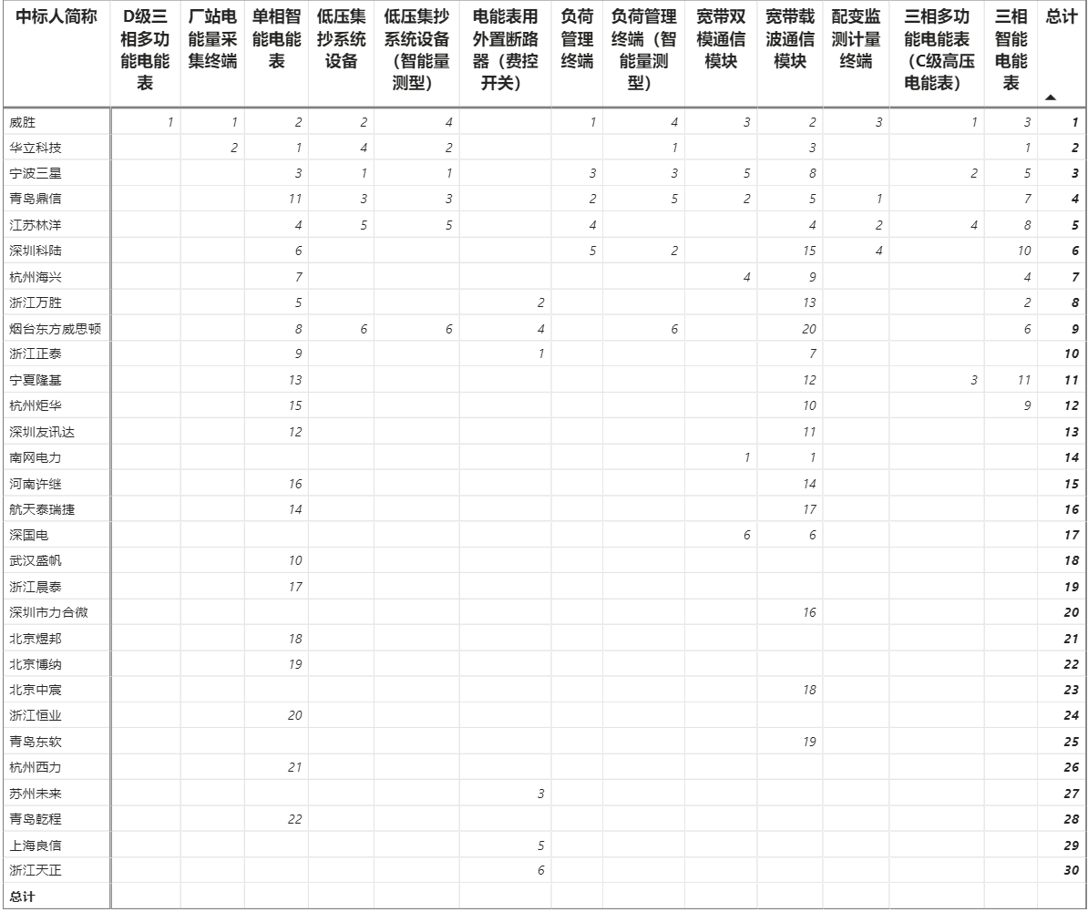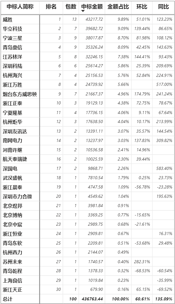 總金額43.68億元,30家企業(yè)實現(xiàn)中標(biāo)(威勝集團+威勝信息計為1家,正泰電器+正泰儀表計為1家),威勝以4.32億元位列各企業(yè)第一名,華立中標(biāo)3.97億元第二,三星3.80億元第三,鼎信3.53億元第四。