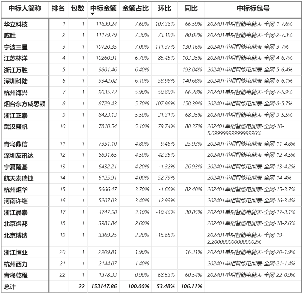 總金額15.31億元,22家企業(yè)實現(xiàn)中標(biāo),華立中標(biāo)最大包1.16億元;