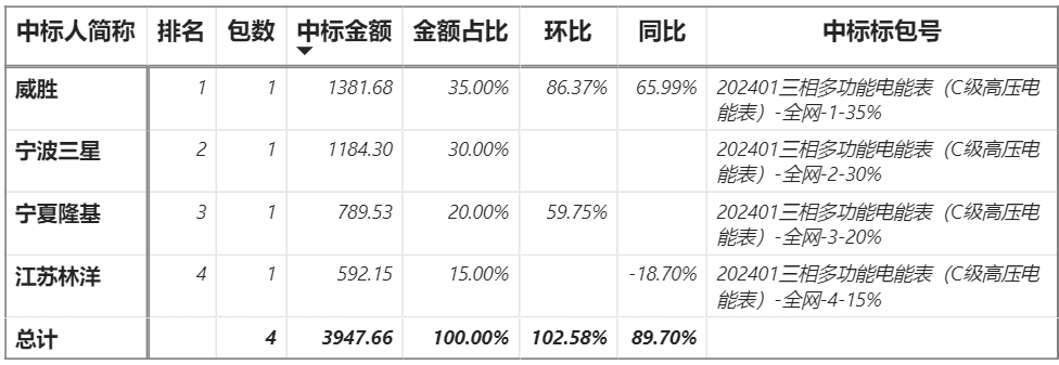 總金額3947.66萬元,4家企業(yè)實現(xiàn)中標(biāo),威勝中標(biāo)最大包1381.68萬元;