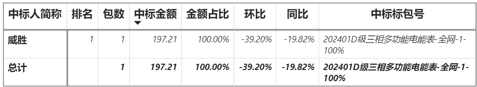 總金額197.21萬元,1家企業(yè)實現(xiàn)中標(biāo),威勝中標(biāo)197.21萬元;