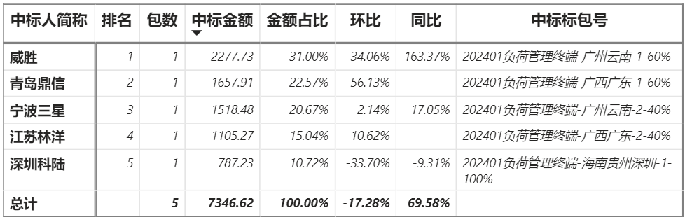 總金額7346.62萬元,5家企業(yè)實現(xiàn)中標(biāo),威勝中標(biāo)最大包2277.73萬元;