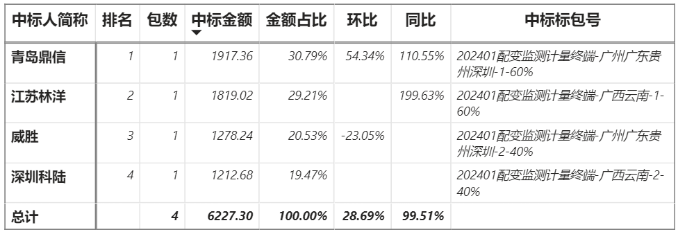 總金額6227.30萬元,4家企業(yè)實現(xiàn)中標(biāo),鼎信中標(biāo)最大包1917.36萬元;