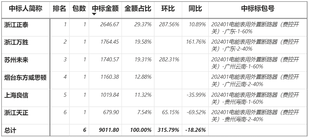 總金額9011.80萬元,6家企業(yè)實現(xiàn)中標(biāo),正泰中標(biāo)最大標(biāo)包2646.67萬元;