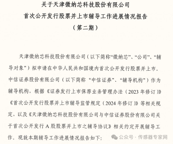 2024年1月19日,中信證券與微納芯簽署了輔導(dǎo)協(xié)議并于同日正式向中國(guó)證券監(jiān)督管理委員會(huì)天津監(jiān)管局(簡(jiǎn)稱(chēng)“天津證監(jiān)局”)報(bào)送輔導(dǎo)備案申請(qǐng)材料;2024年1月22日,天津證監(jiān)局同意微納芯輔導(dǎo)備案并出具輔導(dǎo)備案登記確認(rèn)書(shū)。2024年4月12日,中信證券向天津證監(jiān)局報(bào)送關(guān)于天津微納芯科技股份有限公司首次公開(kāi)發(fā)行股票并上市輔導(dǎo)工作進(jìn)展情況報(bào)告(第一期)。2024年7月10日,中信證券向天津證監(jiān)局報(bào)送關(guān)于天津微納芯科技股份有限公司首次公開(kāi)發(fā)行股票并上市輔導(dǎo)工作進(jìn)展情況報(bào)告(第二期)。截至目前,中信證券對(duì)微納芯的上市輔導(dǎo)工作仍在進(jìn)行中。